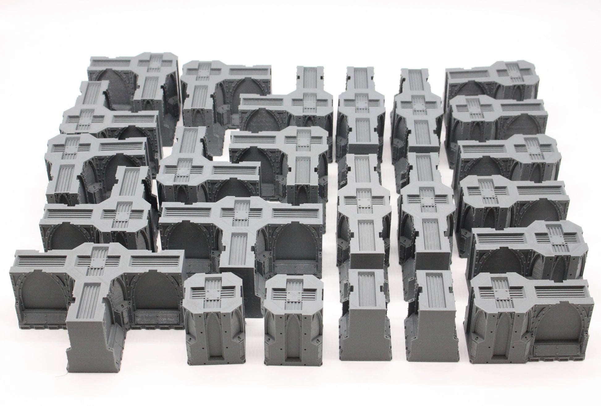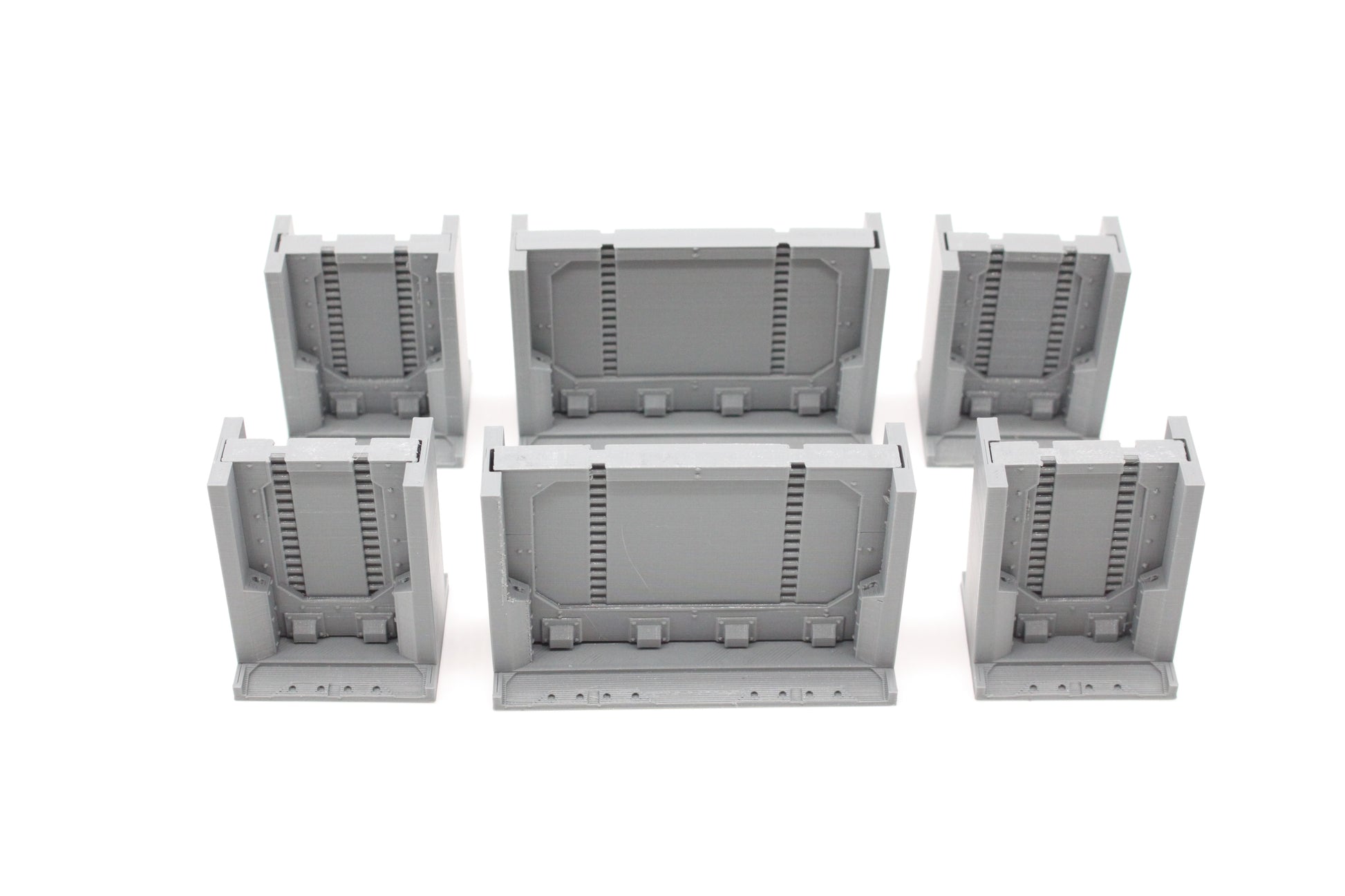 This Bundle consists of 8 corner walls, 2 T-intersection walls, 4 long straight wall, 6 short straight walls, 2 columns, 2 individual walls, 4 single bulkhead doors and 2 double bulkhead door. The pieces can be arranged as pictures or any other orientation you like. The pieces are also scaled to work with any similar terrain pieces you may have...