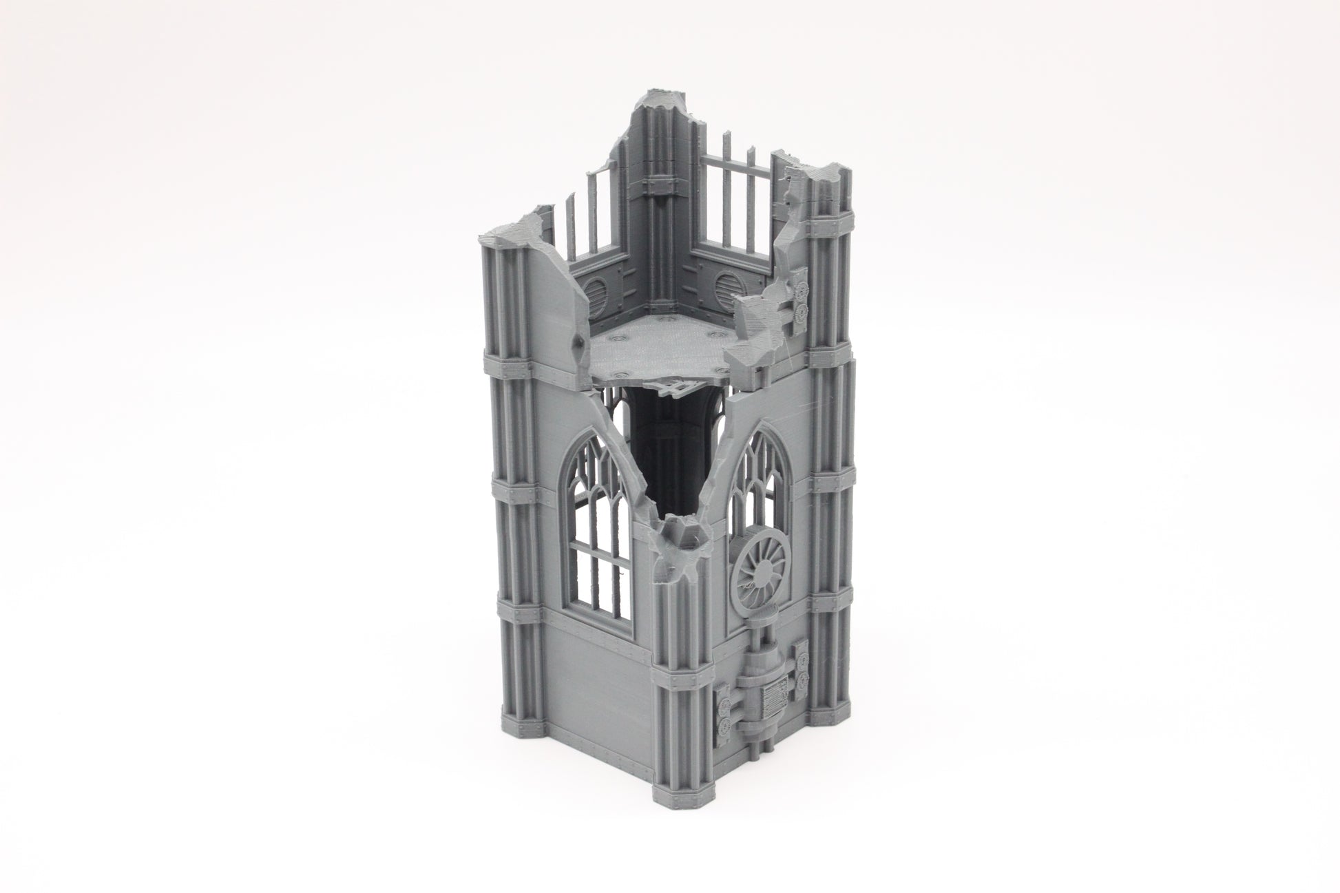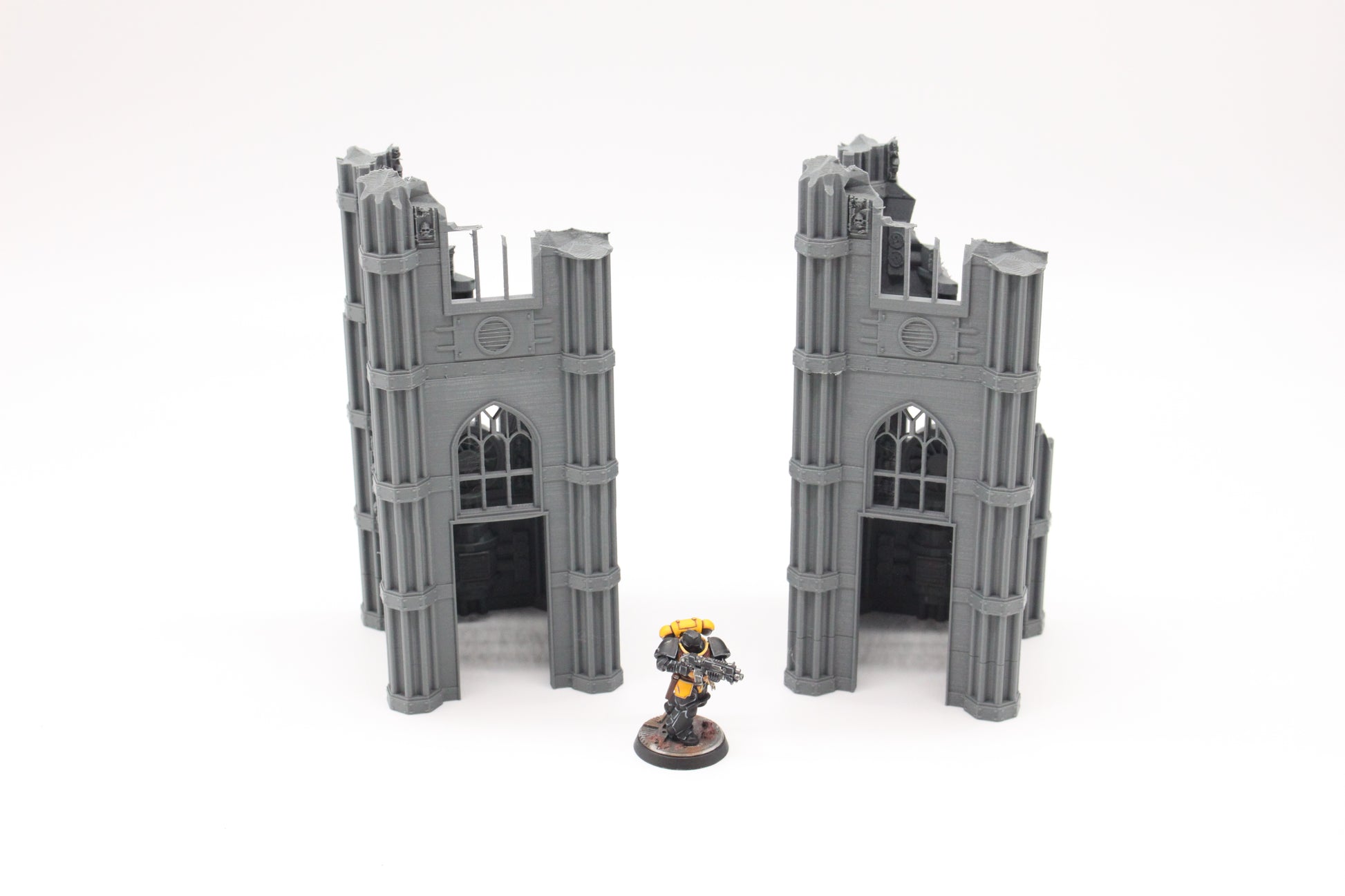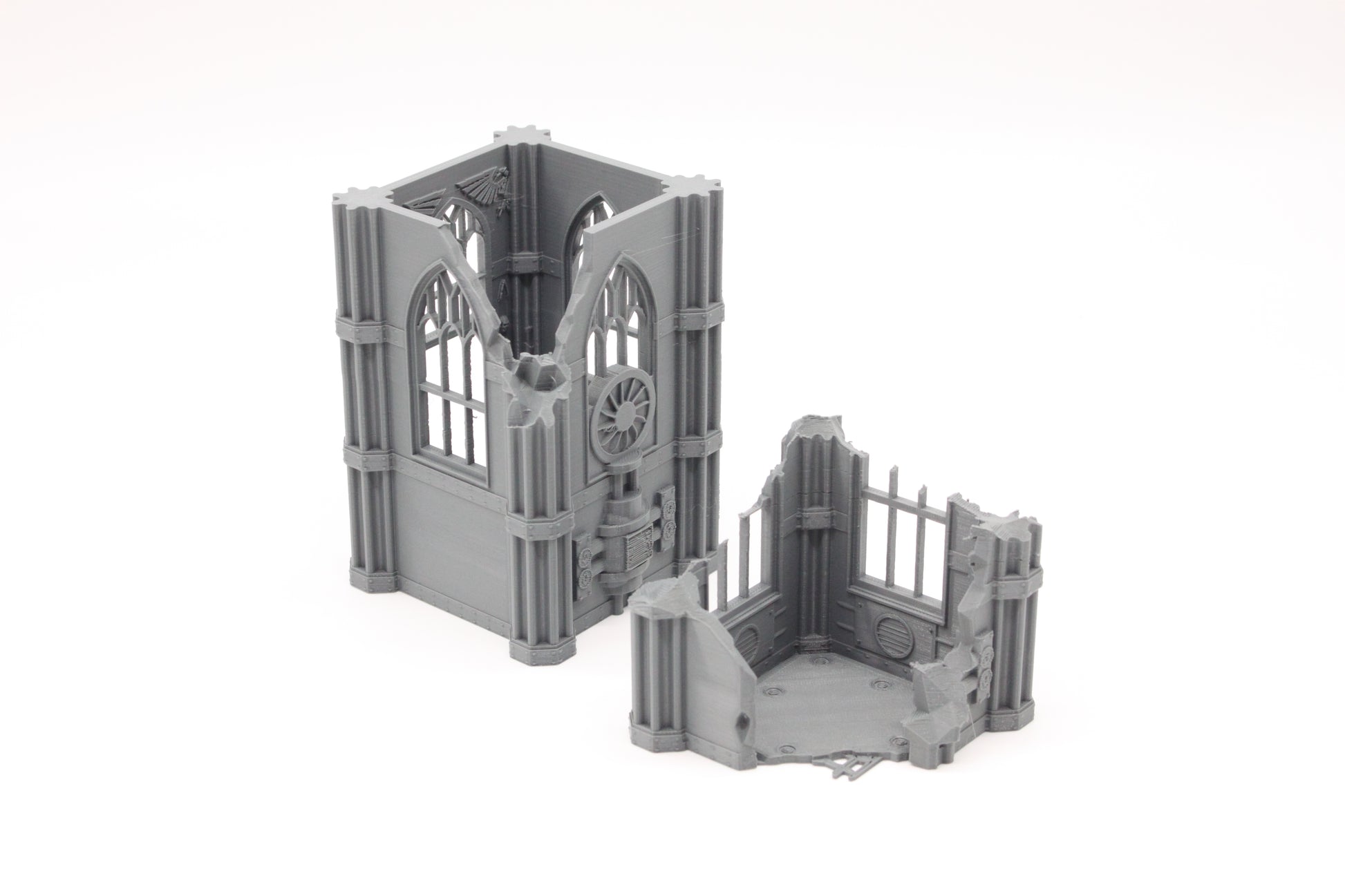 Two, 2 level small square gothic ruined buildings. These items come in two bits each to prevent damage while the item is being shipped. Only a small bit of superglue is needed to glue the two layers together.