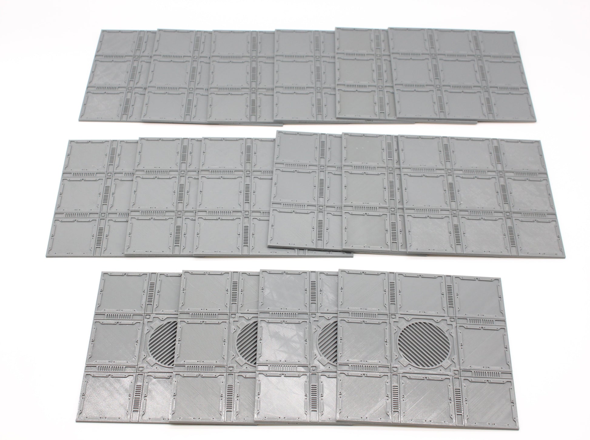 The pieces are printed at 0.2mm resolution. They are printed dark grey PLA plastic. Please see the images for the details of each individual piece. They are 6 inch squares so these bundles either provide a total coverage of 1.5 square feet or 2 square feet depending on the one you order. If you need a larger than 2ft x 2ft table covered please drop us a message.