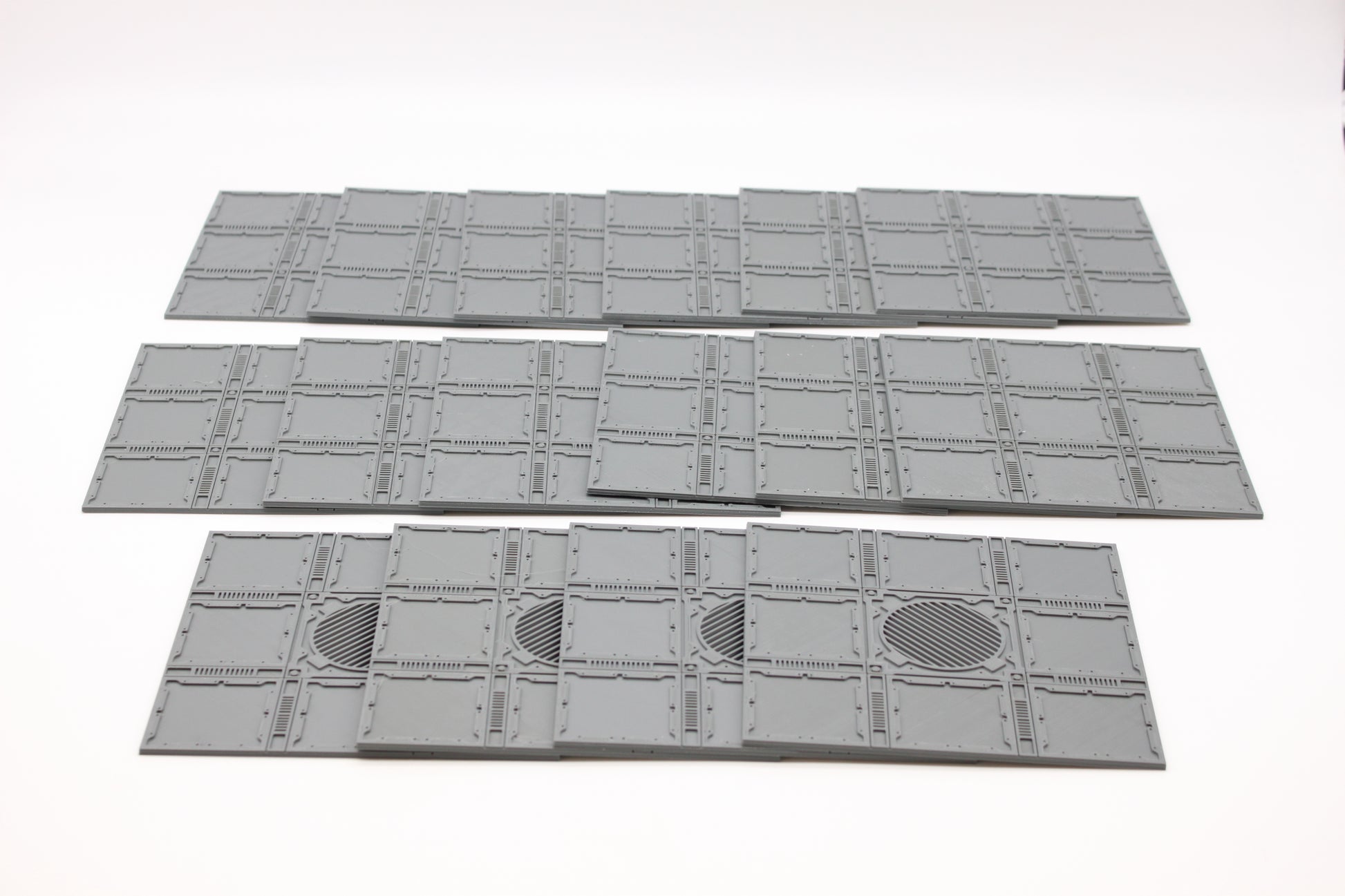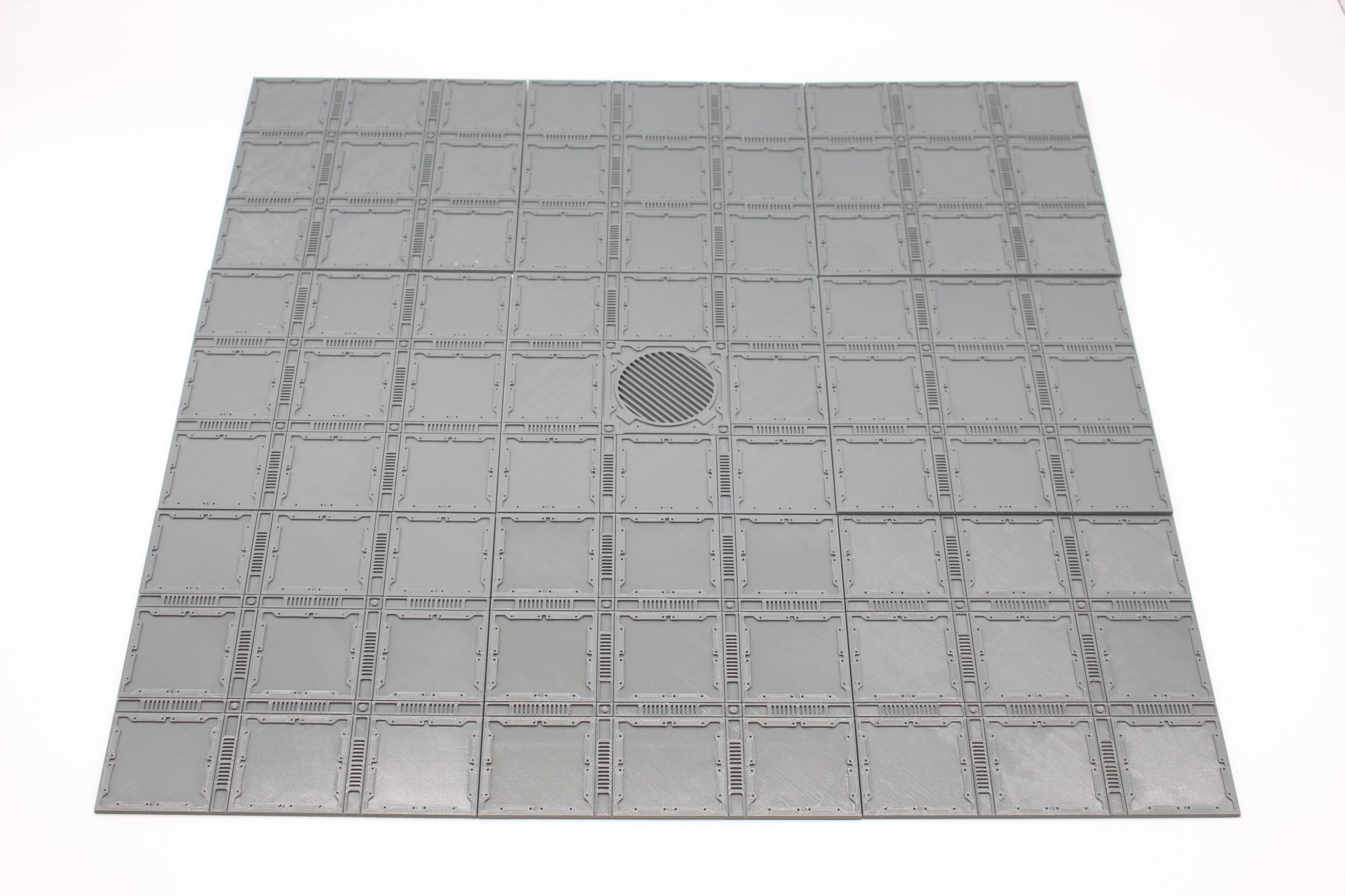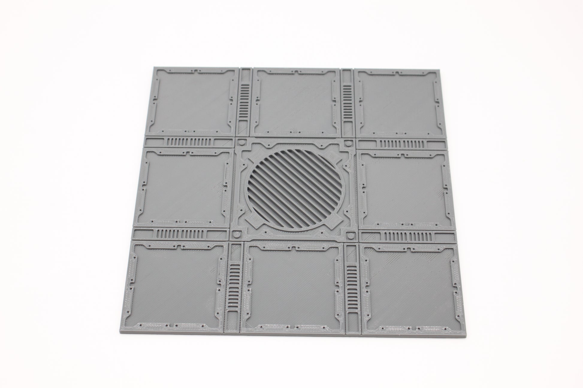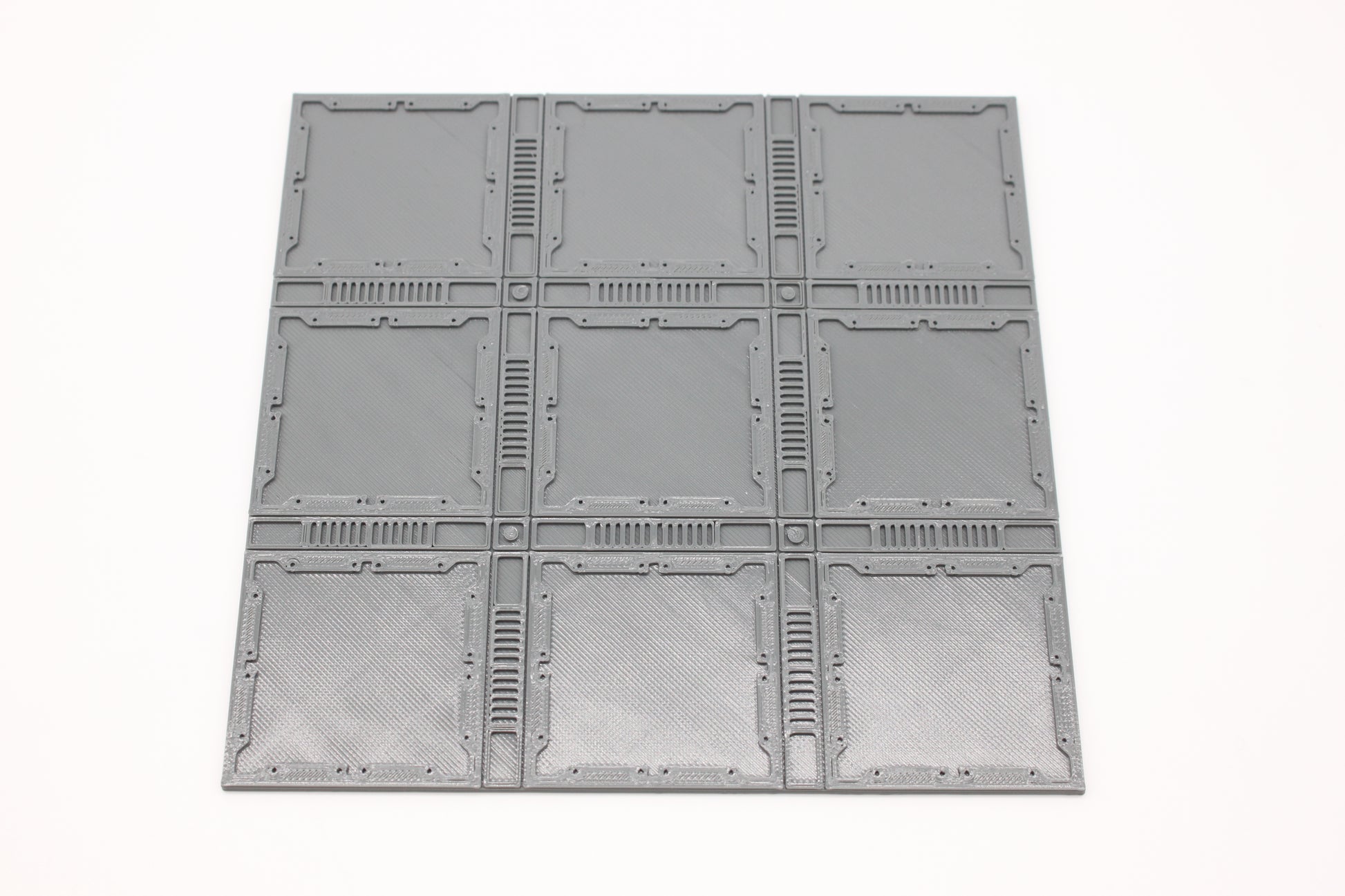 This products has two options. One is for 9 6 inch industrial tiles, 8 plain and 1 with a central grate detail and the other is for 16 tiles, 12 plain and 4 detailed. These pieces can be used to build platforms and base plates for your necromunda games and are also directly compatible with all our other ZM wall bundles and expansion packs.